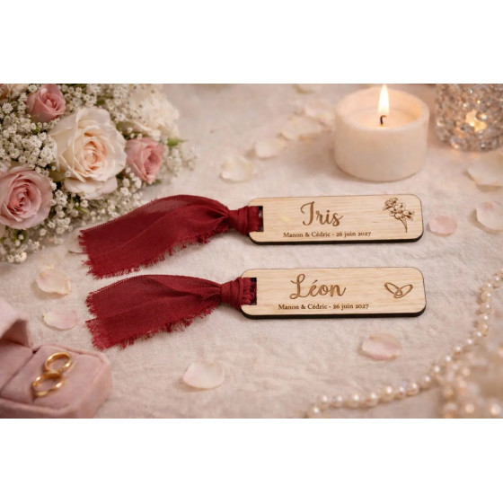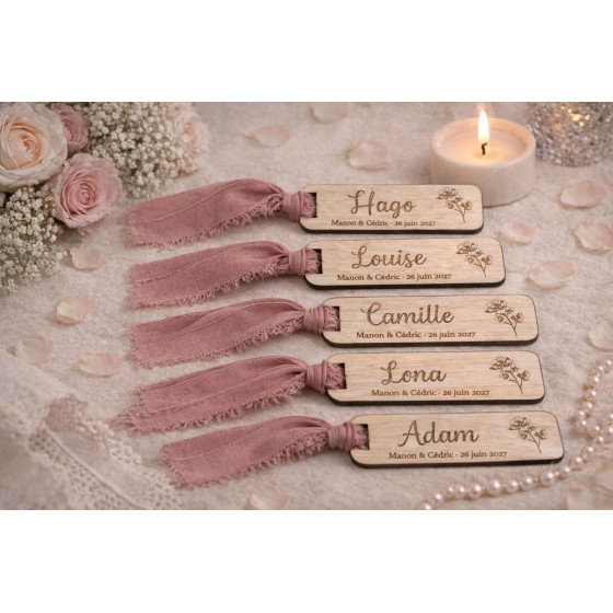 Marque-place en bois personnalisé avec prénom gravé, ruban tissu coloris au choix et motif décoratif possible. Idéal pour...