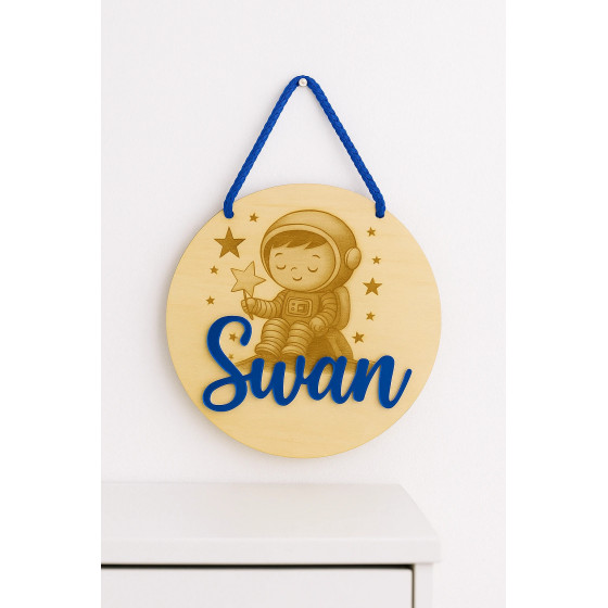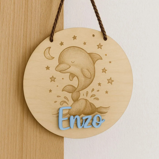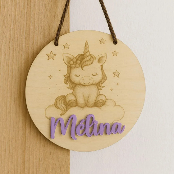 Plaque prénom en bois de bouleau avec motif gravé et prénom en acrylique 3D. Une décoration douce et poétique pour chambre...