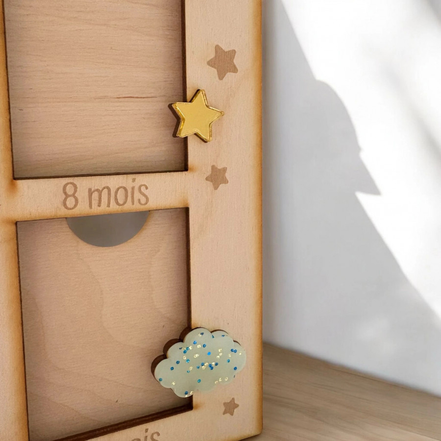 Immortalisez la première année de bébé avec ce cadre en bois personnalisé ! Conçu en contreplaqué de bouleau 3 mm avec décorations en acrylique, il permet d’afficher 13 photos (naissance + 1 à 12 mois). Son design doux et élégant en fait un cadeau parfait pour une naissance ou un baptême.