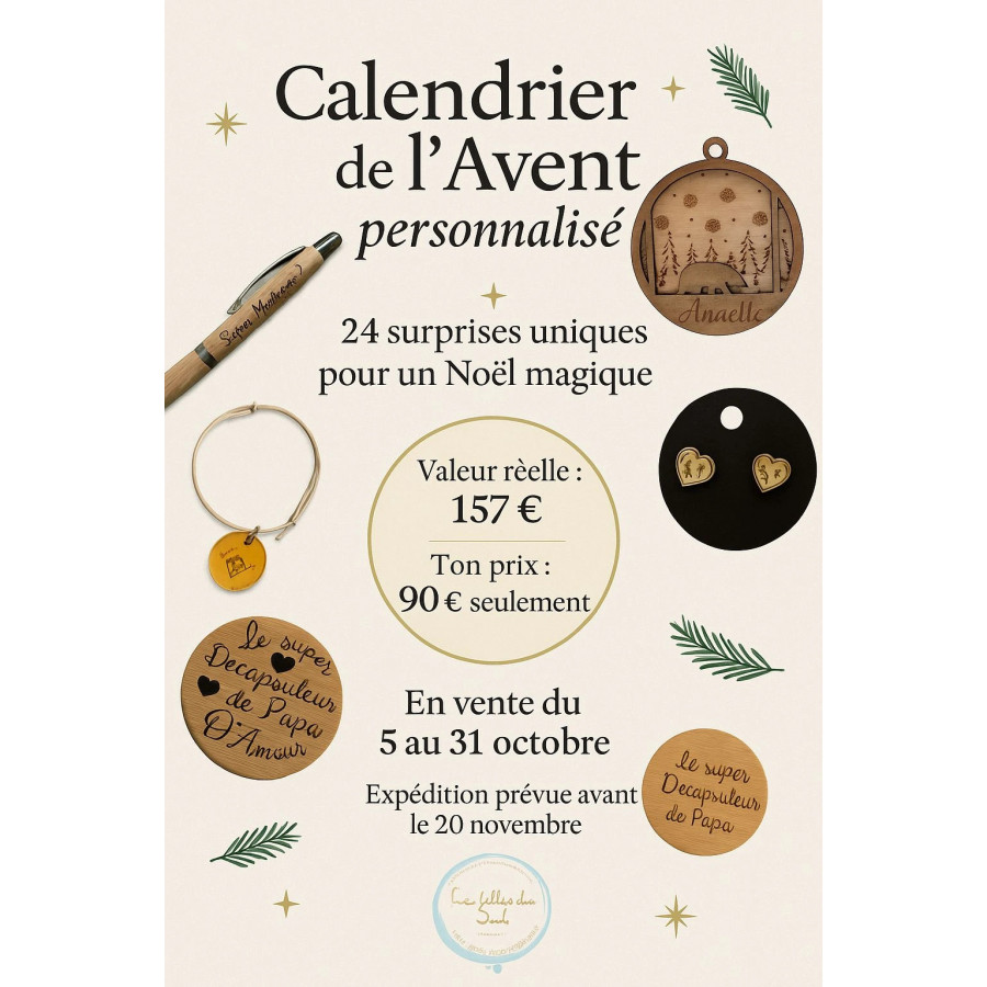 Un calendrier de l’Avent unique et artisanal, rempli de 24 surprises personnalisées selon vos goûts et vos passions.