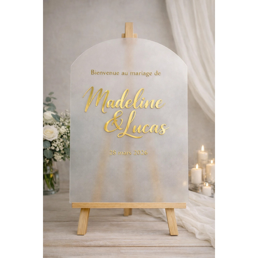 Apportez une touche élégante et moderne à votre décoration avec ce panneau de bienvenue en plexi transparent givré. Son effet délicatement dépoli offre un rendu raffiné et lumineux, tandis que la personnalisation en vinyl permet de créer un panneau parfaitement adapté à votre événement.